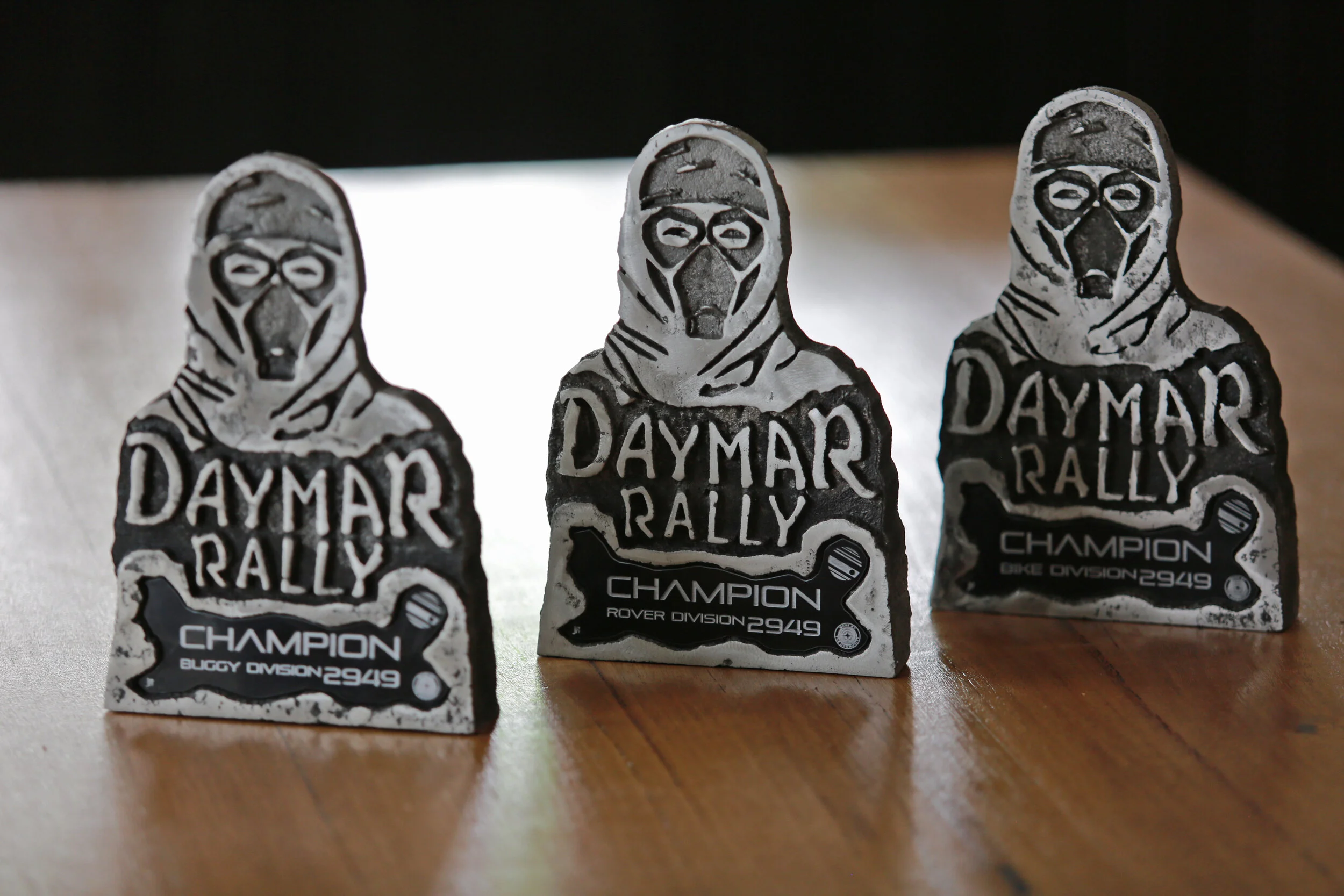 Each year the trophy will be forged with a different metal so you will truly have something unique. 2949 is forged with Aluminium, followed by brass (8kg’s per statue) for 2950. They measure approximately 28cm’s tall and can be yours for taking first place in the Daymar Rally. One trophy per team, per division will be issued to the winning team.