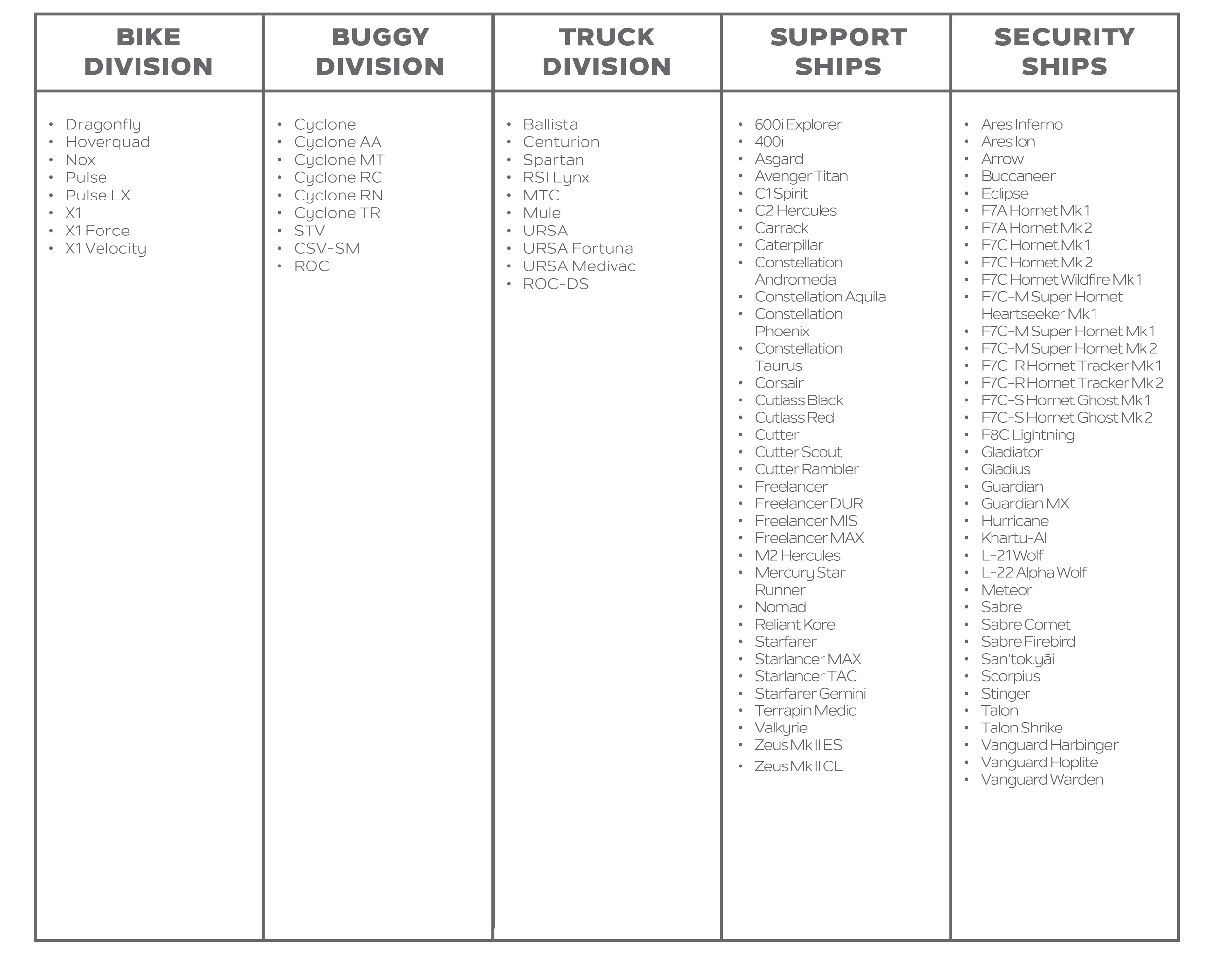 Vehicle & Ship Lists